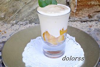 Montaje del postre: En una copa o vaso poner los dados de nectarina en el fondo, encima poner una parte de la mezcla de crema y coronar con un poco del helado de galleta blando.