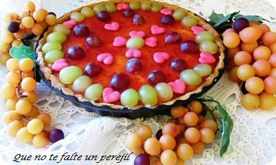 Para la primera elegí esta deliciosa Tarta de Queso con cobertura de gelatina de Mermelada de tomate, fresa, canela e hierbabuena. Para adornarla me decidí por uvas. De todos es sabido que las "uvas con queso, saben a besos" y yo a ella le doy muchos, muchos besitos.