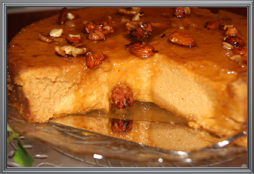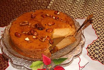 Encendemos el horno a 350° F. o 180° C.Ponemos en una olla pequeña a fuego alto: la taza de azúcar, la ½ taza de agua y las gotas de limón o la pizca de cremor tártaro. No movemos la mezcla hasta que veamos que el caramelo tiene un color ambar claro. Dejamos que el caramelo ozcuresca un poco más, pero teniendo cuidado de que no se ponga muy oscuro; porque, se pondrá demasiado acído y amargo. Agregamos las 2 onza de agua poco a poco. Es necesario tener precaución en este punto; para evitar que el caramelo nos quemé cuando reacione al agua. El caramelo se pondrá un poco más líquido dependiendo de la cantidad de agua que le agreguemos. En este momento agregamos las nueces y las dejamos un poco en la mezcla para que perfume el caramelo. Retiramos el caramelo de la estufa y lo vertemos en un envace y lo dejamos enfríar. Luego de frío vertemos sobre la tarta.