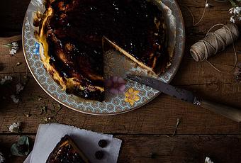Horneamos con calor arriba y abajo + el ventilador. Primero 10 minutos a 220º y luego 40 minutos a 100º o hasta que veamos que está cuajada.No te olvides de dejar enfriar antes de desmoldar.Por último, como presentación le puedes poner un poco de mermelada de mora o similar por encima.