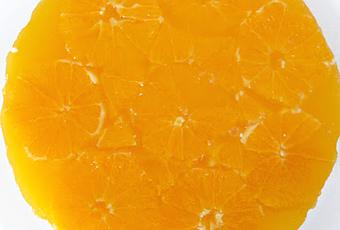 - Al día siguiente preparamos la cobertura: en un cazo ponemos a calentar el zumo de naranja, el agua, el azúcar y el Cointreau (como os dije, éste es opcional). Mientras se calienta a fuego bajo, ponemos a hidratar en un plato hondo con un un poco de agua fría las hojas de gelatina. Una vez tengamos el azúcar disuelto en el cazo, apartamos del fuego y añadimos las hojas de gelatina bien escurridas. Removemos con la varilla hasta que se disuelvan por completo. Reservamos. Pelamos bien las narajas, eliminando la parte blanca. Las cortamos a rodajas de 1 cm. aproximadamente.