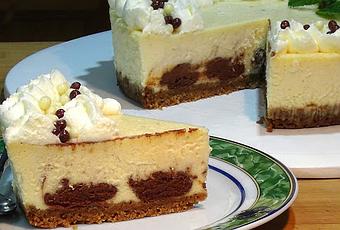 En un recipiente apto para el horno ponemos el molde con la base de galleta ya completamente fría y le vertemos toda la mezcla de queso, con la ayuda de una cuchara le añadimos la mezcla de chocolate con los 100 ml de masa de queso a cucharadas separadas por encima de nuestra tarta, cuando ya tengamos toda la mezcla de chocolate repartido, con la ayuda de un palillo chino o algo similar removemos toda la mezcla un poco de forma que se oculten las cucharadas de chocolate que le hemos puesto, cuando ya lo tengamos a nuestro gusto lo llevamos a hornear con el horno precalentado a 150 ºC (300º F), una vez dentro del horno le vertemos agua caliente a la bandeja hasta que llegue a la mitad del molde de la tarta, lo horneamos al baño María 90 minutos, pincharemos con un palillo para comprobar que sale ya seco (Si al centro sale ligeramente húmedo no pasa nada ya que en el reposo se cuajara por completo), si no, lo dejamos 5 minutos más, pasado este tiempo sacamos la bandeja del horno y la dejamos que se enfrie por completo antes de pasar la tarta a la nevera, tendremos la tarta en la nevera un mínimo de 6 horas.