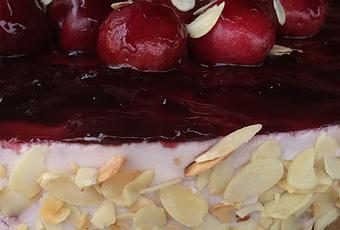 Sacamos el molde de la nevera y vertemos este relleno sobre la base, metemos en la neveray después de algunas horas cuajará y nos permitirá decorarla como mas nos guste. A mi me apeteció poner unas cucharadas de la mermelada de guindas y unas cuantas guindas naturales. Y por el borde unas laminas de almendra que previamente he tostado en una sartén, sin aceite ni nada, solo tostarlas para que suelten un olorcito estupendo.