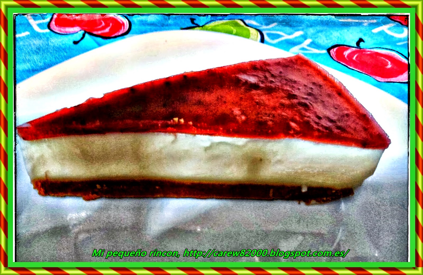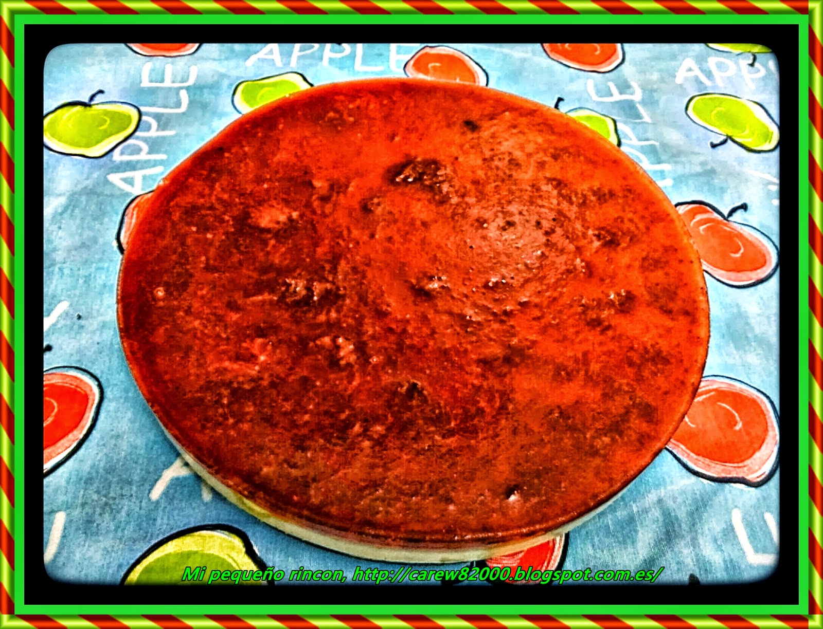 La gelatina de mermeladaPonemos otra cazuela al fuego y echamos el bote de mermelada y dejamos que se caliente, mientras tanto ponemos las hojas de gelatina en agua para deshidratarlas, una vez caliente la mermelada y liquida sacamos las hojas de gelatina y secamos con un papel y las echamos a la mermelada removemos varias veces y retiramos del fuego, seguimos removiendo hasta que las hojas hayan desaparecido.Sacamos la tarta del frigo y echamos la mermelada por encima utilizando una cuchara para que no caiga directamente en la tarta, volvemos a meter en el frigorífico y dejamos 2 horas mas, pasado ese tiempo ya está lista para comer.