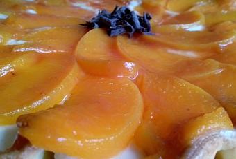 Ponemos la masa brisa en un molde desmontable, previamente pintado con mantequilla. Pinchamos la base con un tenedor y ponemos garbanzos por encima para que no se levante al hornearla. Introducimos en el horno, 180º hasta que la veamos doradita. Sacar y dejar enfriar.En el vaso de la thermomix ponemos el resto de ingredientes, menos los melocotones y la mermelada.Programa velocidad 6, 6 segundos y después 90º,12 minutos,velocidad 1.Quita los garbanzos que pusimos en la masa y vierte esta crema de queso sobre ella. Mete en el frigorífico, al menos 4 horas, para que cuaje.Transcurrido este tiempo, adorna con los melocotones cortados en tiras y pinta con la mermelada. Pon los los pétalos de chocolate en el centro e introduce en el frigorífico de nuevo, hasta la hora de servir.