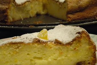 Es una tarta de queso pero sin masa, con trocitos de naranja confitada, Si quieres hacerle una base de tarta dulce, también la puedes poner.