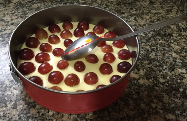Volcamos al molde sobre la base de galletas, colocamos las uvas en forma decorativa que habremos cortado mientras se hacia la crema (lo que se trata que la uva se cuaje en la crema y reservamos en el frigorífico hasta que haya cuajado. Yo os aconsejo que la hagáis de un día para otro.