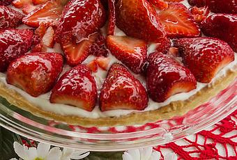 Ingredientes:Para la base: -60 gr. De harina -2 cucharadas de azúcar -90 gr. De mantequilla troceada -1 huevo Para el relleno -250g. de requesón -200g. de crema agria -100g. de azúcar glas -1 cucharadita de ron blanco Para la cobertura -500g. de fresas -30g. de mermelada de fresas.
