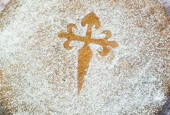 Imprimid una cruz de Santiago, la ponéis sobre la tarta una vez haya enfriado y espolvoreáis bien de azúcar glass, yo lo suelo hacer con un colador. Mucho cuidado al levantar la cruz, coged bien por los dos extremos para que no se os estropee la decoración.