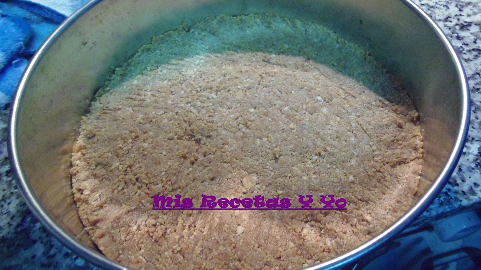 Hacemos la base, picando las galletas y desahciendo la mantequilla, y lo mezclamos.Ponemos la pasta en un molde desmontable. Reservamos.