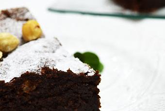 Por dentro queda súper jugosa, creo que en las fotos se puede apreciar el brillo que posee cada corte, y por fuera queda una fina capa crujiente. La jugosidad del interior no se debe a que no esté lo suficientemente cocida, como sí que ocurre con otros pasteles de chocolate, que se sacan del horno antes de que se hagan por dentro para que queden blanditos. En este caso, está perfectamente cuajado y la jugosidad de su interior se debe a la grasa de las avellanas.