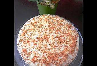 Dejamos enfriar el bizcocho y lo partimos por la mitad para rellenarlo con la mermelada de fresa. Y finalmente, cubrimos toda la superficie del bizcocho con la crema de mantequilla. Nosotras lo espolvoreamos con crocanti para darle un toque crujiente.