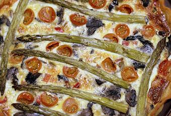 A continuación, coloqué las verduras al dente, sobre la base. Como tenía unas "sobras" de champiñones al ajillo, decidí que este podía ser su momento de gloria y los incorporé también. Después cubrimos el conjunto con la mezcla de nata, queso y huevos, y decoré, rellenando los huecos, con tomates cherry partidos por la mitad, y con espárragos frescos, (si queréis podéis escaldarlos un minuto en agua hirviendo), colocados formando una escalera. Aunque queden (ver la foto) un poco por encima de la tarta, no os preocupéis que cuando sube la masa de huevo y crema, envuelve los espárragos y tomates.