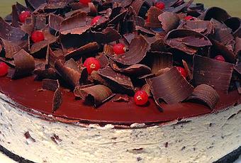 Troceamos menudo el chocolate, calentemos la nata hasta que comience a hervir, la vertemos sobre el chocolate troceado y dejamos reposar un minuto, después le añadimos la mantequilla y removemos hasta integrar esperamos unos minutos hasta que este menos caliente, vertemos la ganache sobre la tarta ya cuajada y sobre la ganache repartimos los rizos de chocolate que tendremos preparados de antelación ( solo con la ayuda de un pelador de patatas lo haremos fácilmente) dejamos reposar la tarta en la nevera al menos 30 minutos más.