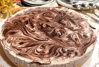 Fundir el chocolate troceado, en microondas o al baño María, y dejar atemperar. Incorporar la mitad a la tarta, dar un par de vueltas para mezclarlo levemente y crear un efecto marmolado.