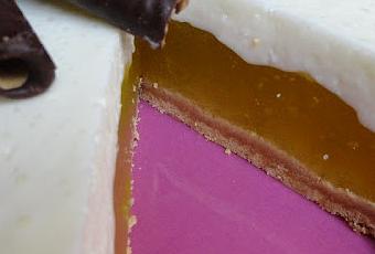 Cuando la base de la tarta esté dura y la gelatina haya adquirido la consistencia adecuada, repartiremos la gelatina sobre la base de la tarta, procurando que no ocupe todo el diámetro de la base (para que la fanta no se vea desde fuera).