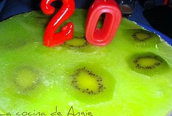 - Cuando la tarta esté cuajada, preparar la capa de gelatina con un sobre de gelatina de kiwi y ½ litro de agua. Pelar 2 kiwis y cortar en rodajas finas. Cuando esté lista verter un poco sobre la capa de yogur y colocar encima las rodajas de kiwi. Cuando esta capa esté cuajada verter otro poco más; cuando los kiwis no se muevan, echar el resto de gelatina y dejar cuajar.