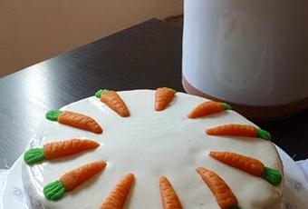 Tapamos con la otra mitad. Cubrimos la tarta con cobertura y adornamos con las zanahorias de mazapán. Guardamos en el frigorífico hasta la hora de tomarla.