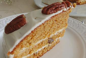 Para el montaje de la tarta dividimos nuestro bizcocho en tres capas. Añadimos glaseado y luego cubrimos el pastel o bien sólo la tapa y lo hacemos tipo nude cake. A vuestro gusto. Decoramos con nueces de pecan enteras o troceadas.