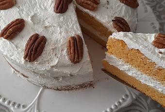 Y ya solo queda montar las capas de bizcocho, frosting, bizcocho, recubrir con el frosting restante y adornar al gusto, en mi caso con pecanas.