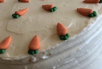 Montaje.Queda la tarea con cuidado y paciencia, poniendo un primer bizcocho, cubrimos con crema y así las tres capas.Una capa por fuera, finita y a la nevera. Cuando se haya enfriado le podemos dar ahora una capa de crema tan gruesa como queramos.Decora a tu gusto, yo usé unas zanahorias de azúcar, pero puedes hacerlas con fondant, o simplemente con un poco de zanahoria rallada.