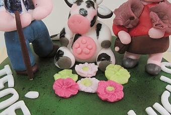 La verdad es que no sabía muy bien como y dónde poner a la vaca, y al final me decidí por hacer una vaquita graciosa que le diera un poco de humor a la tarta