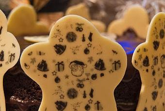 Para decorar la tarta, yo he fundido chocolate blanco y en un papel de horno he hecho figuras de muñecos de jengibre. Luego los he adornado con chocotransfer. Se meten en la nevera hasta que se enfríen y después se quita la hoja de acetato y se queda transferido el dibujo que hayamos hecho con la impresora