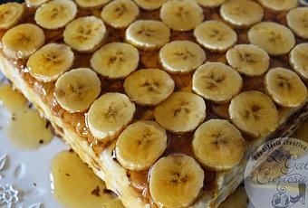 Decoramos con rodajas de plátano a las que habremos puesto un poco de limón para que no se pongan negras, y con abundante caramelo liquido (mejor casero*)