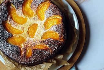 La vertemos en un molde desmoldable engrasado y con papel. Cortamos los melocotones en gajos y cubrimos la parte superior.