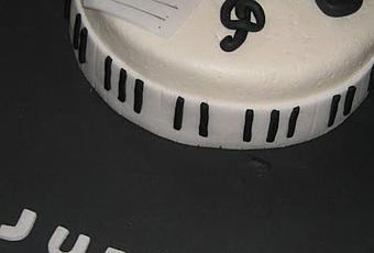 La tarta es de bizcocho brownie de chocolate negro, almíbar de jarabe de arce y relleno de mermelada de fresa, (sabe como los konty o los tigretón de toda la vida).... y fondant negro, fondant de nubes blanca y pasta de goma blanca.....