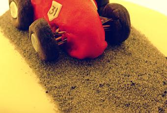 La tarta era de chocolate cubierta de ganache de chocolate y con fondant realizado todos los detalles, excepto la carretera que es azúcar teñida de negro para dar más realismo a la carretera jejeje
