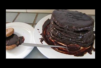 Una vez la tenemos colocamos en un plato llano una galleta que hemos remojado previamente en leche de avena, que nos hará de base, y encima ponemos una buena capa de crema de cacao, a continuación colocamos encima otra galleta y de nuevo crema de cacao y así hasta hacer unos cuatro pisos acabando con crema de cacao.