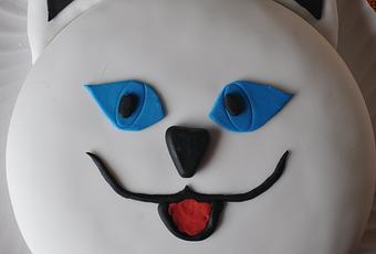 Abrí el bizcocho en tres, lo calé con el almíbar y rellené con la crema de cacao. Pincelé con el frosting, cubrí con el fondant blanco bien estirado. Recorté las orejas con un patrón que hice, y las cubrí con fondant. Las pegué a la cara. Hice los detalles ojos, nariz, boca y demás decoré y listo. Espero que os guste.