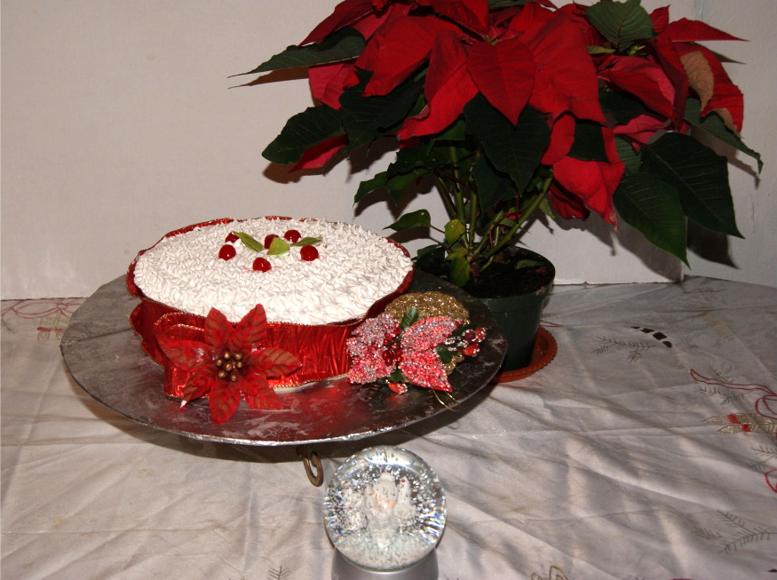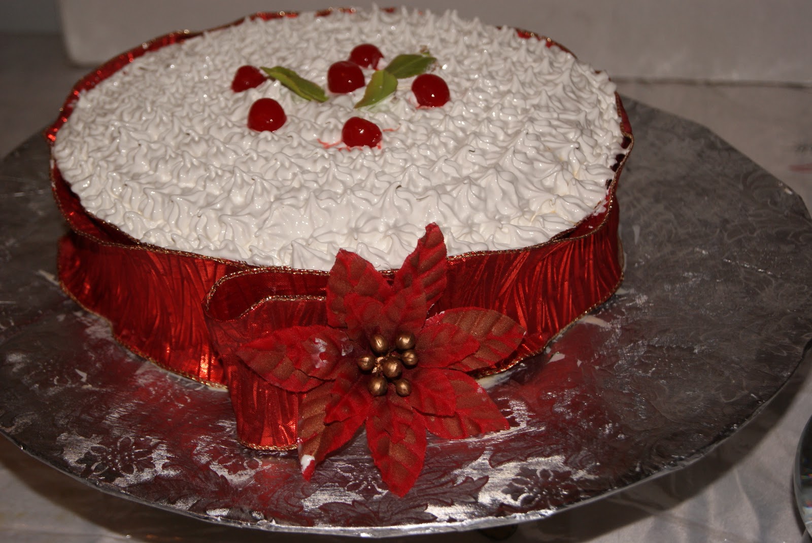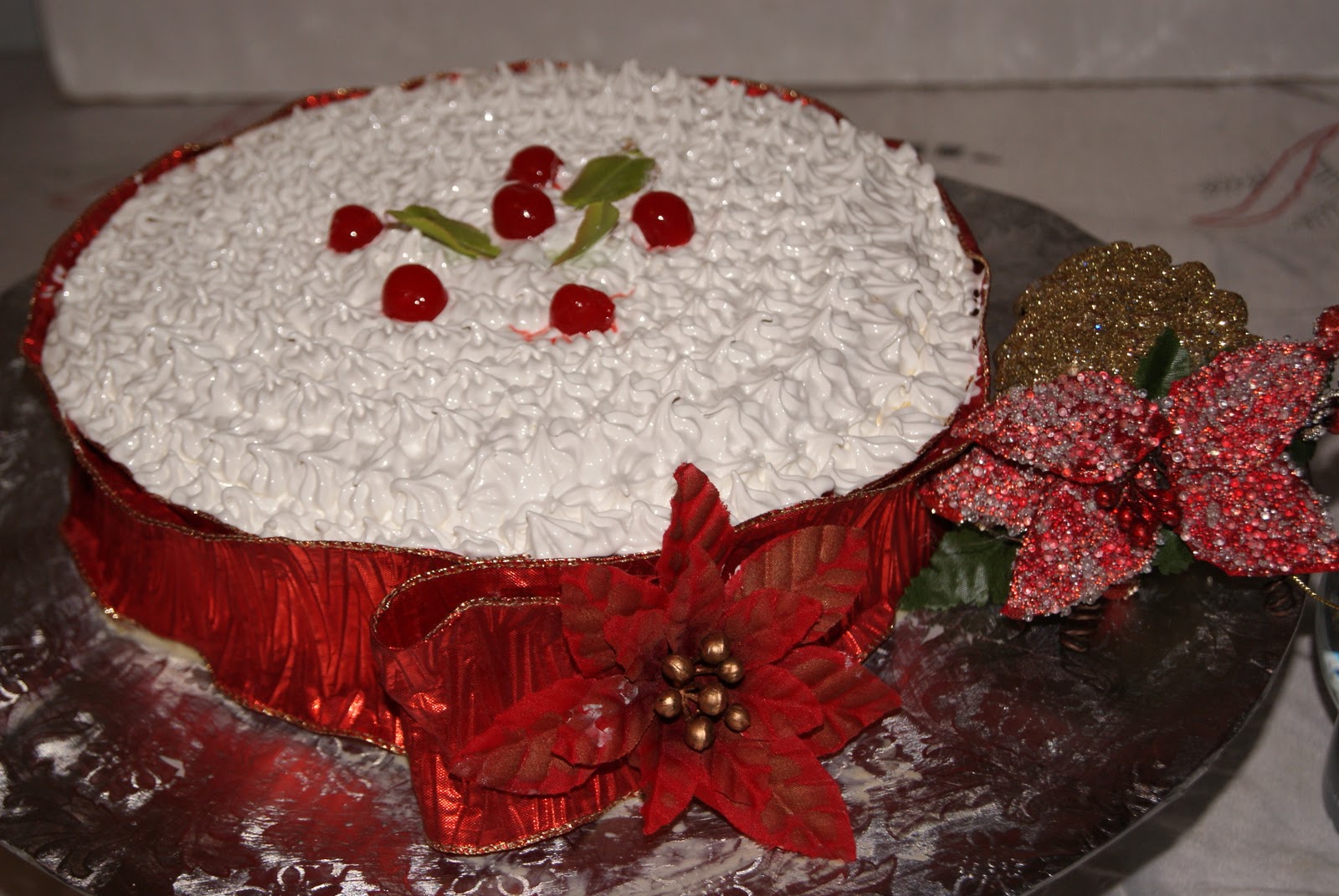 Lo decoré con cerezas marroquies y hojas hecha en pasta de goma. Para los lados del bizcocho utilice una cinta navideña para hacerlo más festivo.