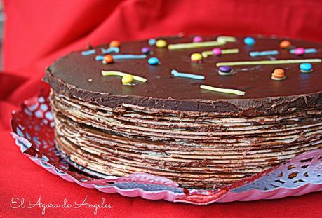 En un molde redondo desmontable de tamaño similar a las obleas, formamos capas de oblea, Nocilla untada y así hasta terminar con todas las obleas.