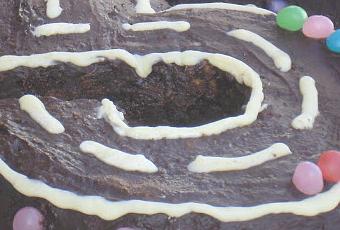Ponemos el chocolate en un recipiente apto para microondas y lo fundimos un par de minutos. Con este chocolate fundido unimos los bizcochos y con el chocolate restante cubrimos toda la superficie. Decoramos con unas pastillas de colores.Por otro lado fundimos el chocolate blanco, lo introducimos en un biberón y vamos formando las líneas blancas para que se asemeje a una carretera.