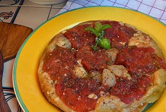 Una tarta invertida es aquella a la que ponemos la masa sobre el relleno. El ejemplo más típico es el tatín de manzana. Hecha esta primera aclaración, decir también que la idea de este plato la saqué de la Tarta invertida de tomates de Cocineros Argentinos (un magnífico programa culinario de larga trayectoria en Argentina). Se trata de un plato muy sugerente y sabroso, pero muy sencillo. Yo he incluido algunas tareas, como la de pelar los tomates, que podrían saltarse. También se trata de una preparación que admite muchas variantes. En primer lugar, según el tipo de tomates que usemos. Pero, también, por la cantidad de rellenos que podemos poner. Yo lo he hecho con queso raclette, albahaca y tomillo, pero podría haber sido otro queso (mejor que sea fundente) y cualquier otra hierba aromática. Pero habrían muchas más posibilidades que dejo a la mente de cada cual para poderlas desarrollar.