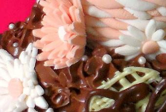 Podemos llenar la cestita con bombones de chocolate o otro tipo de chuches y después colocar las flores y mariposas según nos guste.