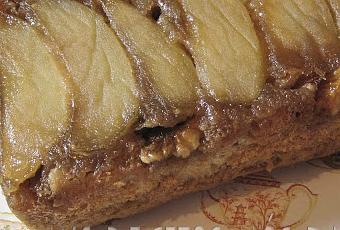 Bate 50 g de mantequilla con el azúcar moreno y extiéndelo en un molde rectangular, engrasado y con la base y los laterales forrados de papel vegetal Corta media manzana, la pelas y la cortas en láminas, coloca la manzana en el molde e intercala una nuez entre cada lámina de manzana