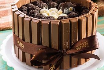 Colocamos las barritas de chocolate alrededor del bizcocho, presionando ligeramente con el dedo, para que se adhiera a la cobertura (así no se caen). Colocamos la cinta decorativa alrededor del bizcocho y le hacemos un lazo.