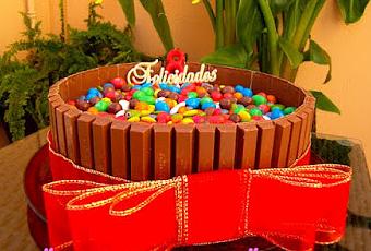 Ingredientes:12 huevos360 gramos de azúcar200 gramos de harina de repostería120 gramos de cacaoAlmíbar de hebra floja15 Envases de 4 barras de Kit Kat1 envase de lacasitos de 180 gr1 envase de M&M´s de 200 gr1 bote 400 gramos de Nutella