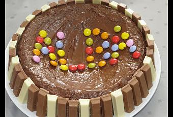 Ingredientes:- 1 bizcocho de chocolate:- Kit Kat.- Nocilla o crema de cacao- Grajeas de colores o Lacasitos.Elaboración:Realizamos nuestro bizcocho al horno puede ser el típico de yogur, pero como es una tarta de chocolate le podéis añadir cacao y darle ese toque que encantará a los pequeños de la casa. En el siguiente enlace os dejo la receta: http://lacucharaenlamaleta.blogspot.com/2017/03/tarta-pez-de-lacasitos.htmlUna vez que tenéis el bizcocho, metéis medio bote de nocilla al microondas durante unos segundos para derretirla y lo bañáis, luego colocáis por el borde el kit kat, yo lo he partido en dos por el grosor del bizcocho y luego ponéis encima las grajeas de colores, para que no quedará demasiado empalagoso, yo he colocado el nombre de mi pequeña.