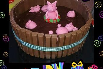 y como el del cumpleaños elige su tarta... el estaba completamente encaprichado de esta, asique toca un bizcocho de chocolate relleno de ganache de chocolate, lodazal de nutella y barril de kit-kats!!