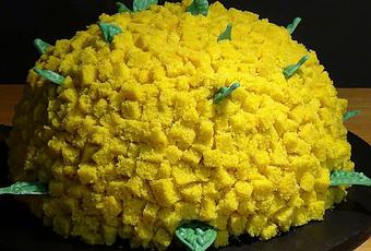 Tarta Extremadamente suave y esponjosa rellena de crema pastelera a la que se añade la nata semimontada, un bizcocho bañado con un riquísimo almíbar con ron u otro licor y un aspecto que recuerda la flor de la mimosa por un bizcocho desmigado que hace de cobertura que le da ese aspecto. La tarta Mimosa tiene su origen en Italia que se prepara con motivo del día de la Mujer el 8 de Marzo.