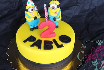 Elisa quería para el segundo cumpleaños de su hijo una tarta de minions, algo sencillo y divertido, y creo que con esta tarta dimos en el clavo.