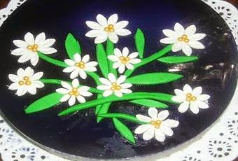 Puse en dos copa porque me sobro mousse, y las decores con una margaritas de fondant, y unos cristales de violetas.