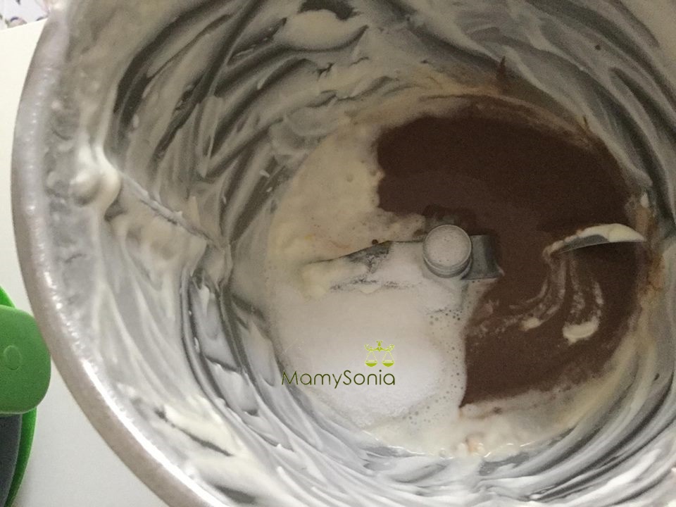 Dejamos templar. Vamos añadiendo poco a poco a la nata montada, con movimientos envolventes. Montamos la clara a punto de nieve e incorporamos a nuestra mezcla, también con mucho cuidado, que quede todo bien mezclado, pero sin que se nos baje.
