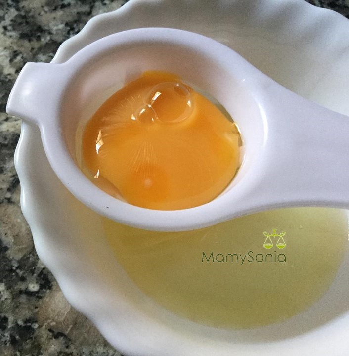 Montamos la nata y la guardamos en el frigorífico. Separamos la clara de la yema.