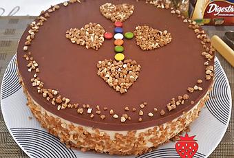 Preparación de la Cobertura:Ponemos a hidratar las hojas de gelatina en agua fría. Calentamos la nata en el microondas. Disolvemos en la nata las hojas de gelatina, moviendo bien con unas varillas manuales y le ponemos el chocolate troceado. Calentamos un poquito más la leche si hace falta y movemos bien para que el chocolate quede completamente disuelto y cremoso.Sacamos la tarta del frigo; arañamos la base con un tenedor para que agarre mejor la cobertura de chocolate; la extendemos bien. La pasamos al frigo hasta que cuaje la cobertura, 3 horas aproximadamente.La sacamos y adornamos al gusto . Yo le he puesto unas almendras crocanti alrededor de toda la tartaA la cobertura le he puesto también almendras crocanti ( he utilizado un molde en forma de corazón y los he rellenado con las almendras),y le he puesto unos lacasitos como veis. Quedará deliciosa elijáis la decoración que queráis!!!La pasamos al frigo que cuaje bien (a mi me gusta dejarla de un dia para otro ).Lista para degustar esta delicia!!!! Os aseguro que merece la pena prepararla ..tan suave y a la vez con ese toque crujiente... tan rica..ummm