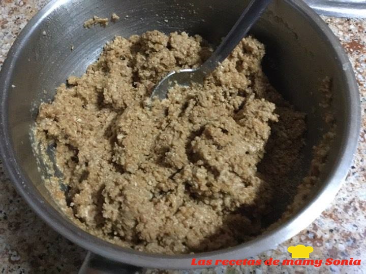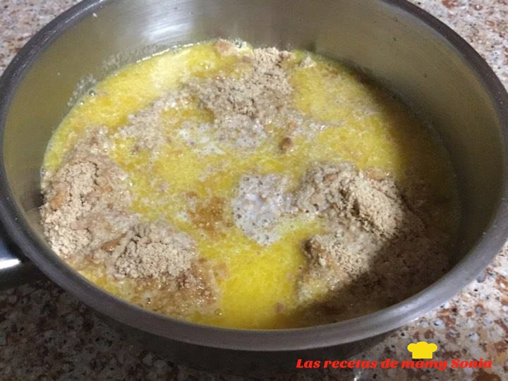 Derretimos la mantequilla en el microondas y mezclamos con el polvo de galletas hasta que ambos ingredientes estén bien integrados.